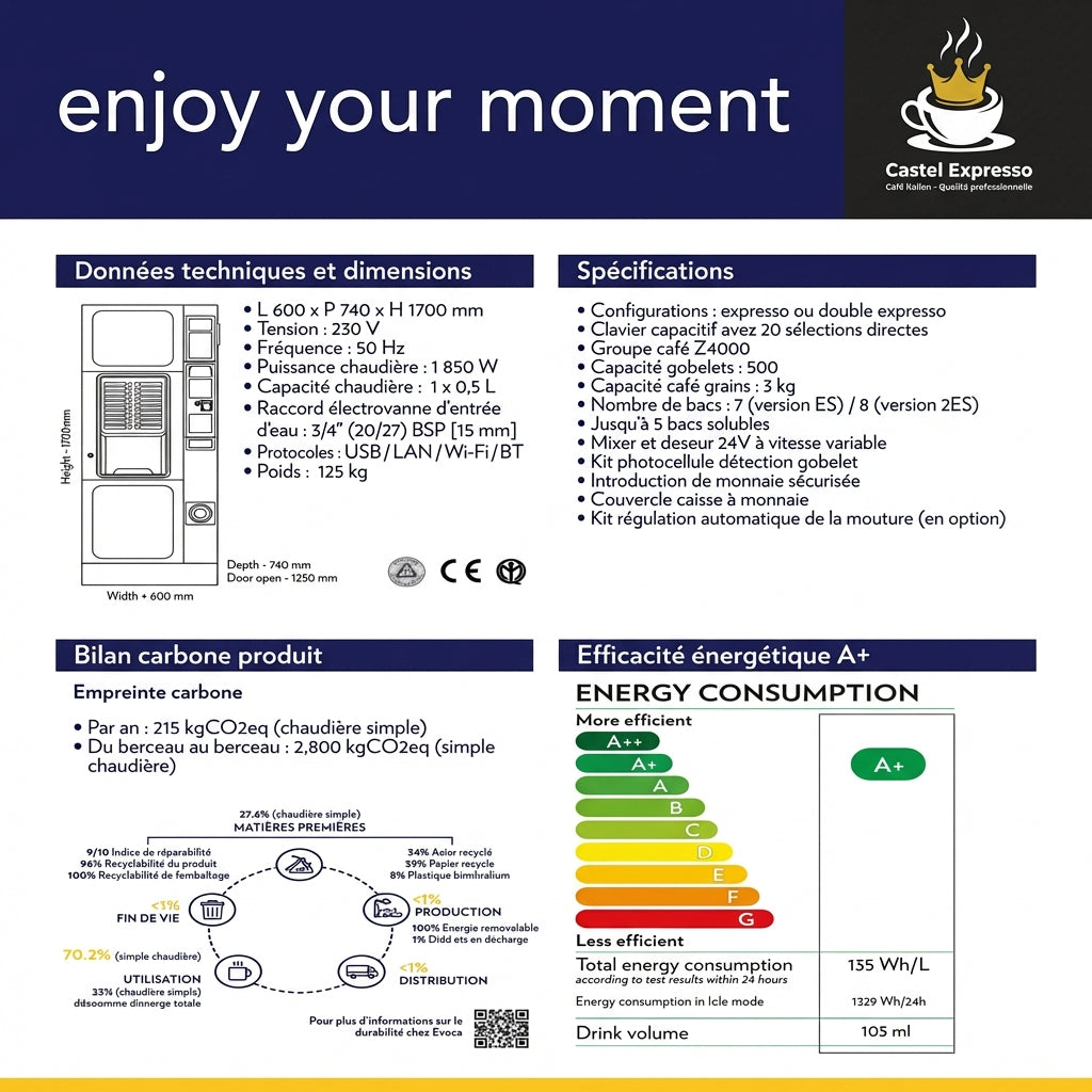 Caractéristiques Techniques Dimensions : 1700 × 600 × 740 mm | Poids : 125 kg Capacité : 500 gobelets | 7 bacs produits | 1 chaudière Puissance : 1850 W | 230V - 50Hz