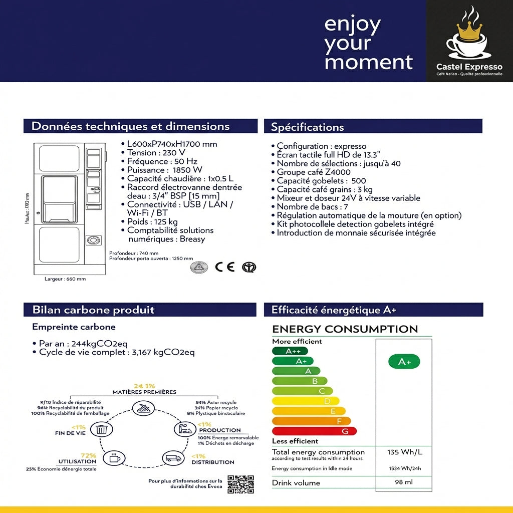 Caractéristiques Techniques Dimensions : 1700 × 600 × 740 mm | Poids : 125 kg Capacité : 500 gobelets | 7 bacs produits | 1 chaudière Puissance : 1850 W | 230V - 50Hz